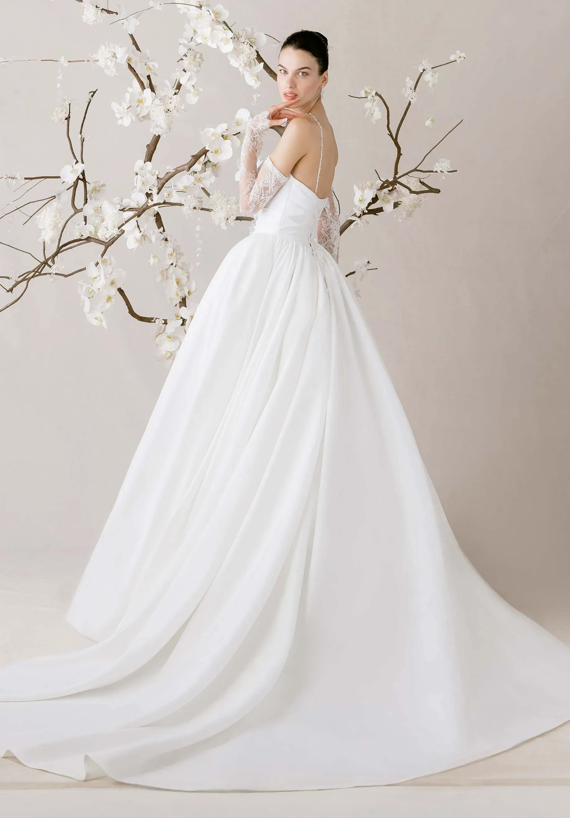 Our Élevé wedding dress is a faille ball gown that captures the elegance of soft movement. The scoop neckline features a sweetheart Chantilly lace peek-a-boo detail, framed by delicate sequin and beaded straps that shimmer with quiet light. A basque waist draws the eye in, enhancing the flare of the skirt, while the lace-up corset back sculpts the silhouette. For an ethereal touch, pair the gown with the matching lace gauntlet sleeves.