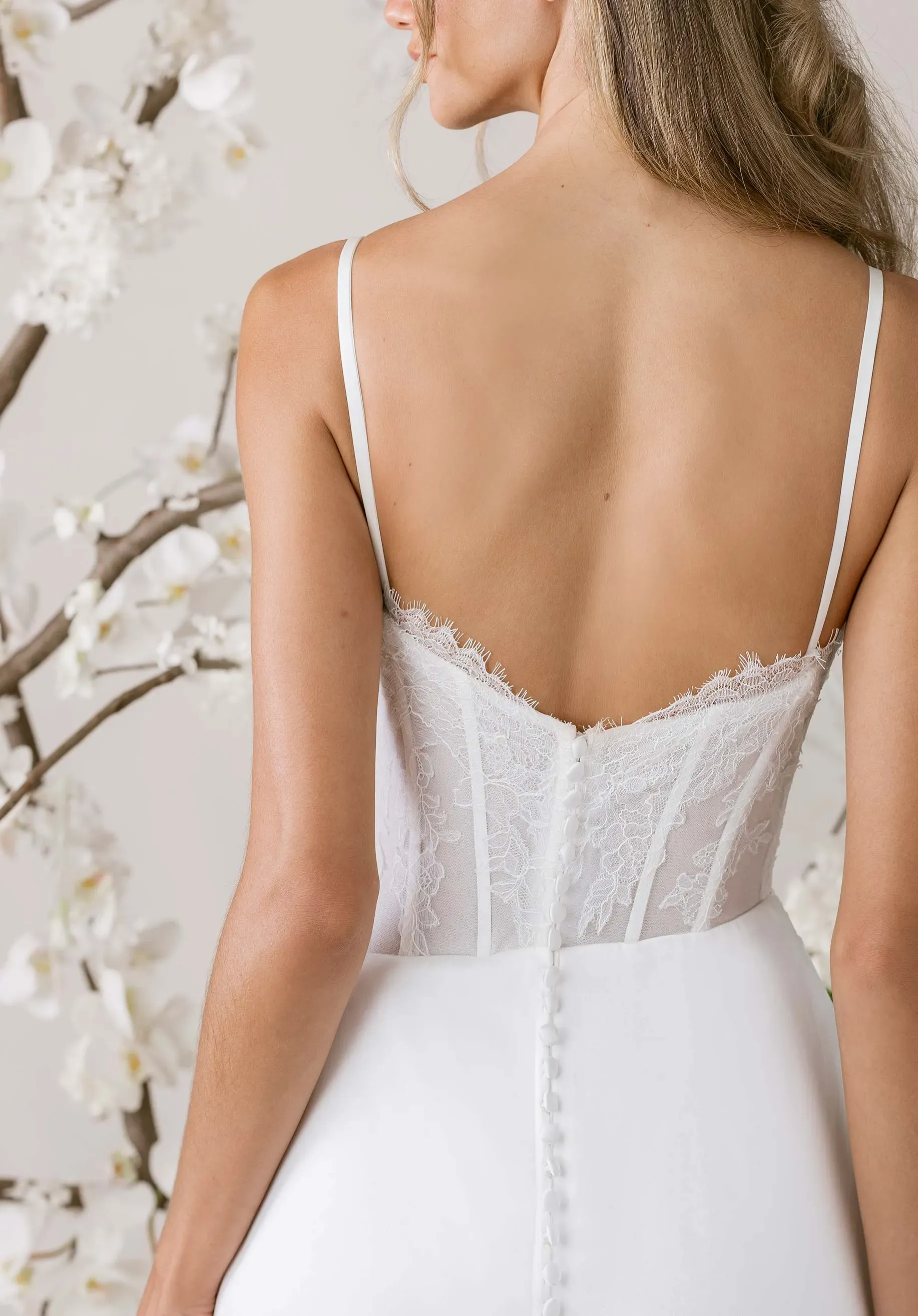 Sensual and refined, our Irina wedding dress is a sheath gown that blends structure and fluidity in perfect harmony. The soft sweetheart neckline is edged with delicate eyelash lace, drawing the eye to the draped satin cowl detail, adding an element of glamour and movement. The corset boned Chantilly lace bodice that sculpts the torso with graceful precision, leading to the asymmetrically draped satin skirt that flows seamlessly from the waist, opening to a slit that reveals just the right amount of leg with each step. Every detail, from the interplay of lace and satin to the strategic draping, creates a gown that's romantic, sculpted, and quietly seductive.