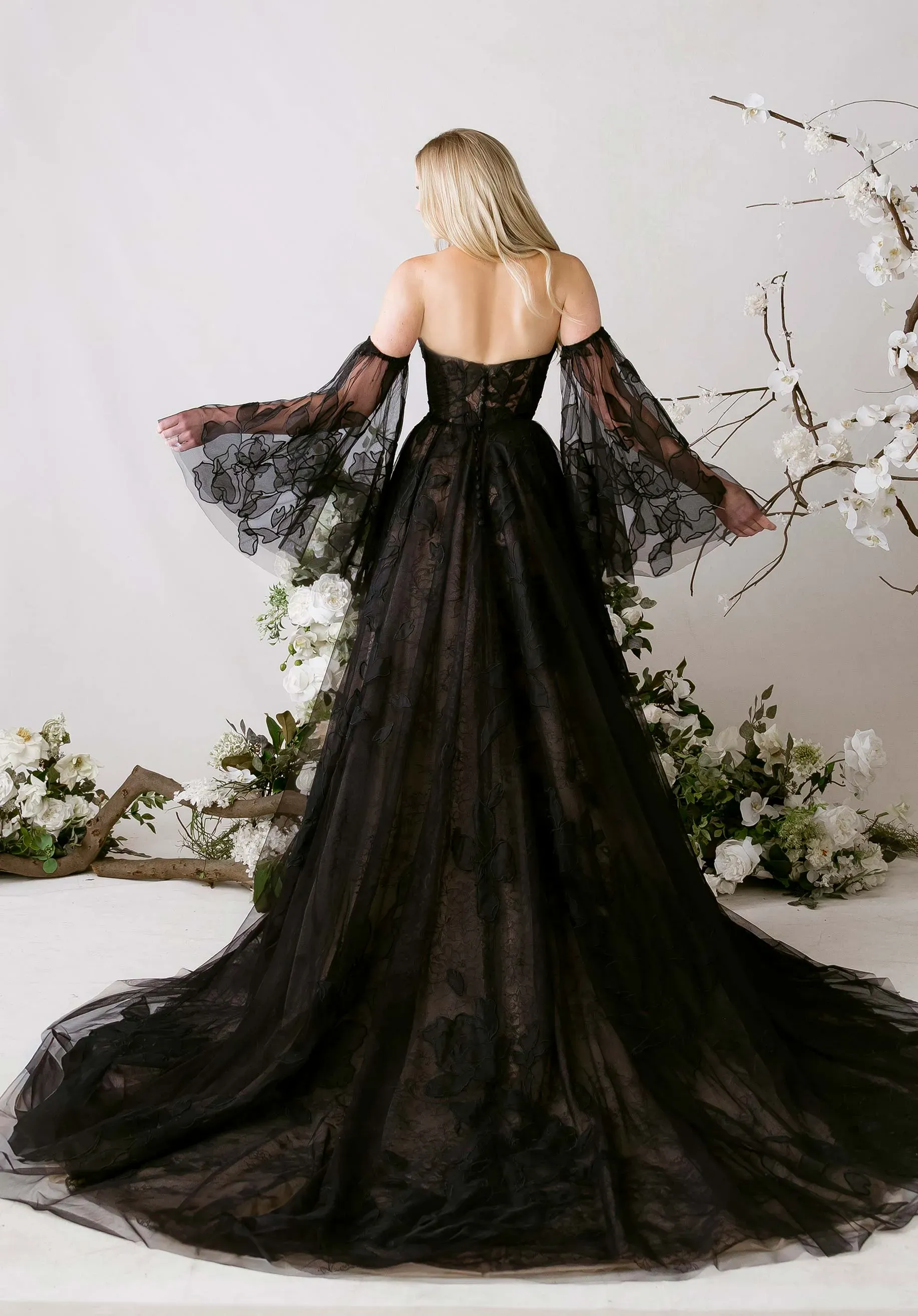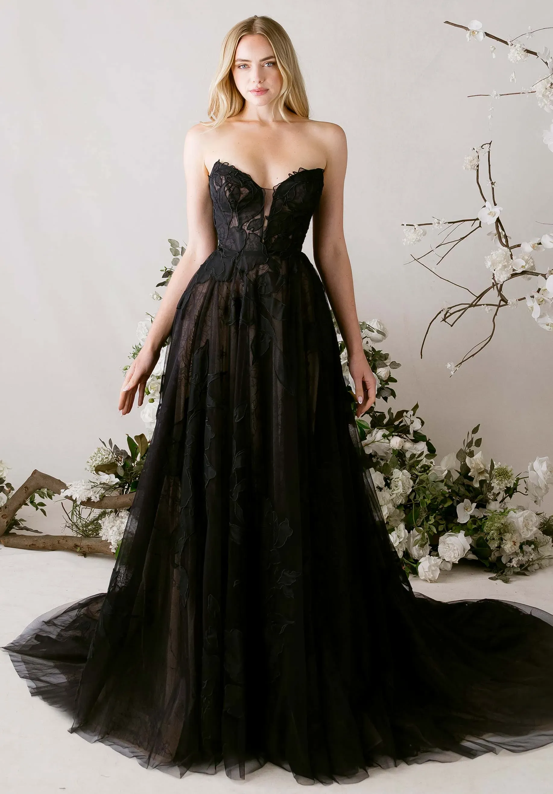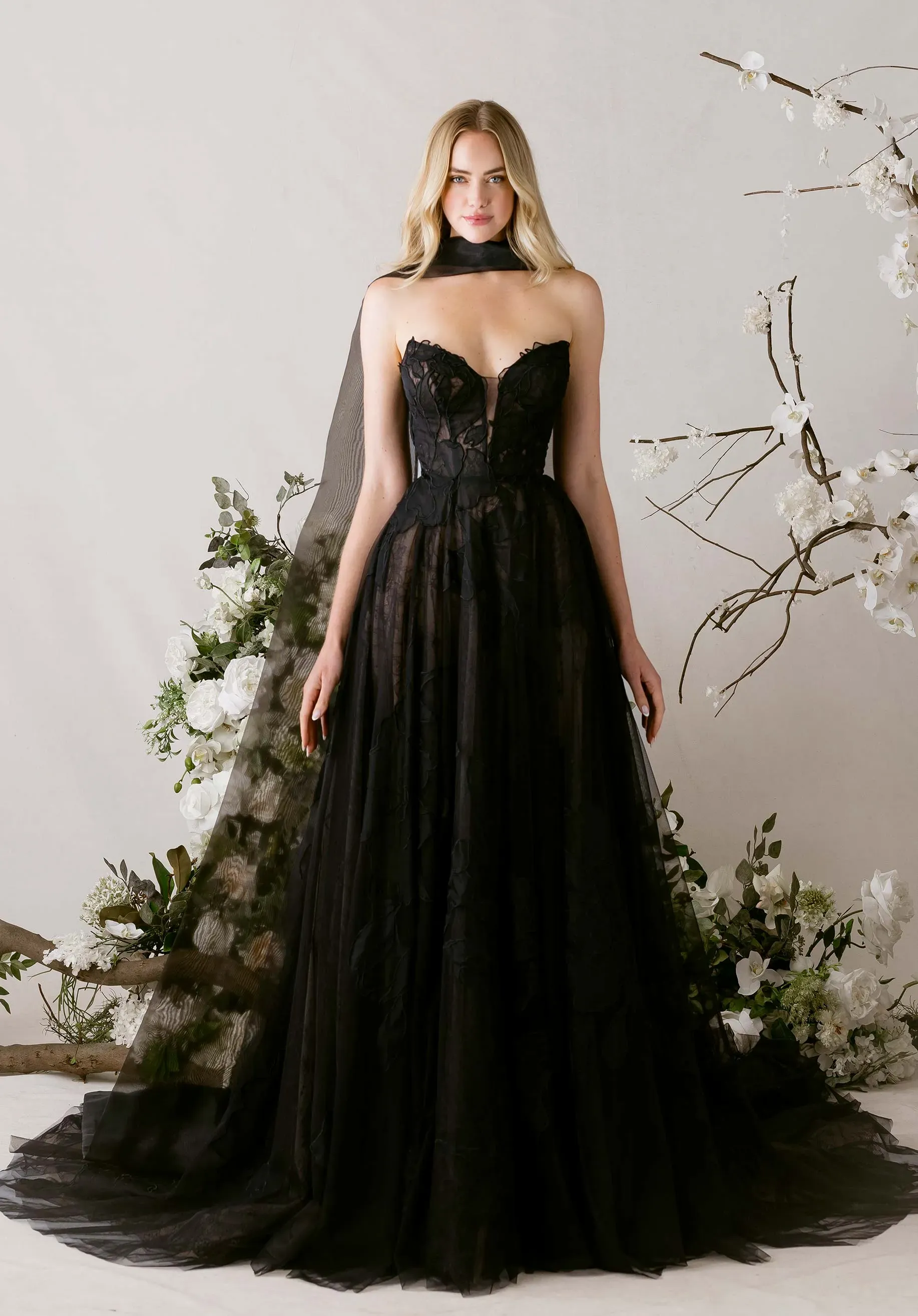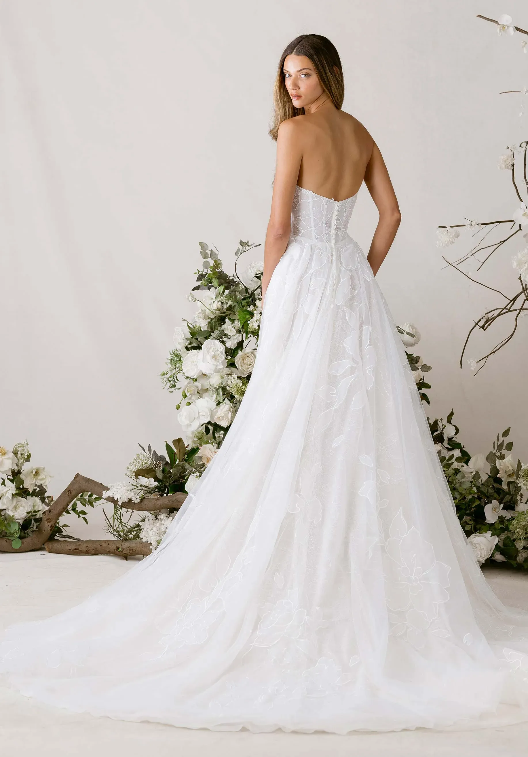 Our Tendu wedding dress is a delicately enchanting A-line gown that dances with romantic movement. A strapless, plunging cat eye neckline draws the eye down to the layers of floral burnout organza appliqué tulle over soft Chantilly lace, creating depth and texture with every glance. Detachable burnout organza flare sleeves drift gracefully from the shoulders, while a flowing organza neck scarf adds a whisper of ethereal elegance. The skirt floats with gentle, airy motion, embodying a gown that is simultaneously soft, sculpted, and poetically light.