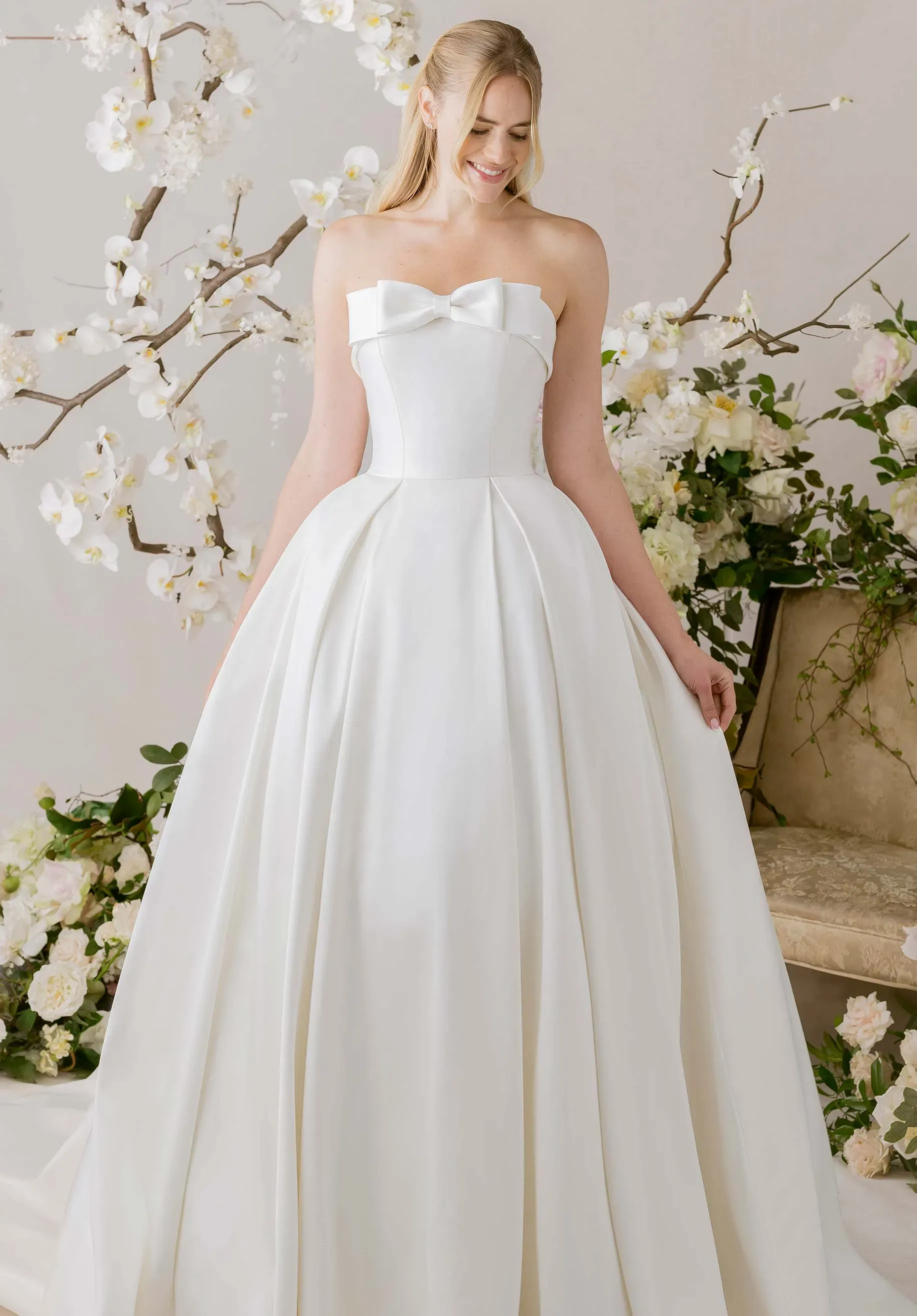 Structured yet ethereal, our Allegro wedding dress is a Mikado ball gown that exudes timeless elegance. The strapless straight neckline flows into a sculpted bodice, while a detachable fold-over bow adds a playful, romantic accent. A box-pleated skirt falls gracefully, finished with buttons trailing to a chapel-length train, creating a sense of movement that is both refined and effortlessly poetic.