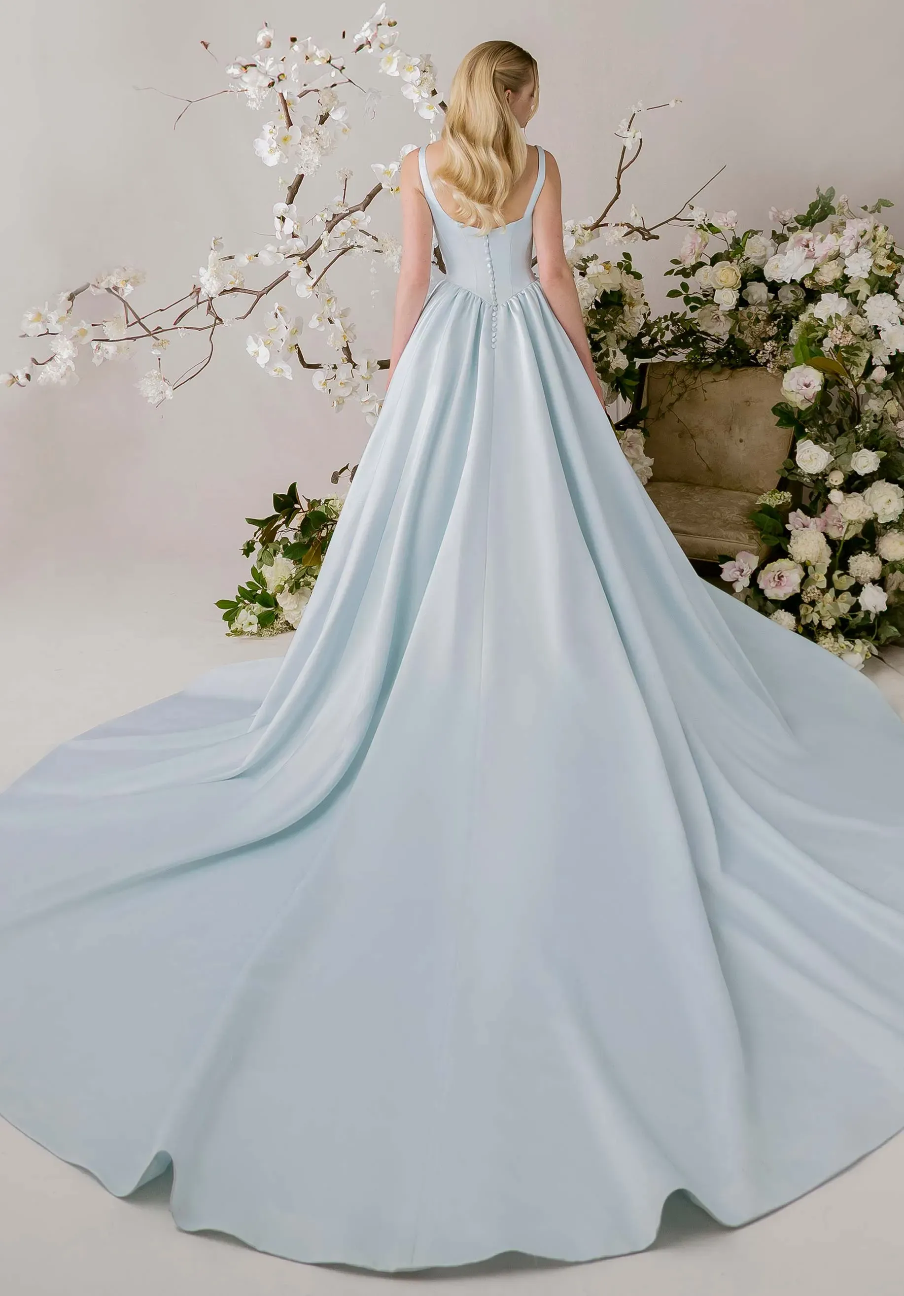 Our Karinska wedding dress combines classic elegance with whimsical movement. The soft sweetheart bodice has a ruched bust with contoured floral appliqués that flow into a basque waist, drawing the eye down to the pannier-inspired hips add volume and drama. A detachable ribbon sash trails softly, allowing the gown to glide with airy grace in the grand ball gown silhouette.