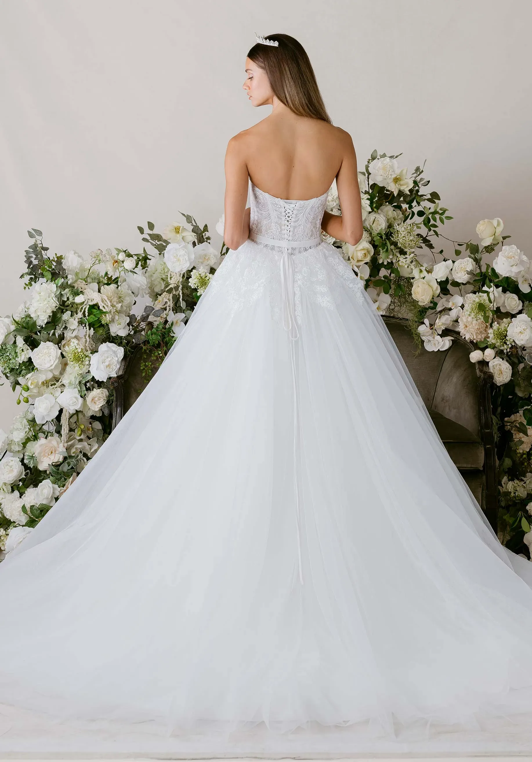 Ethereal and timeless, our Pirouette wedding dress is a ball gown that exudes delicate romance. The strapless bodice features a straight neckline adorned in intricate hand-beaded lace, shimmering with subtle luminosity. A full tulle skirt cascades with airy softness, moving with effortless grace, each step evoking the poetry of motion and the quiet elegance of a dreamlike dance. Grosgrain belt sold separately as Style 55041.