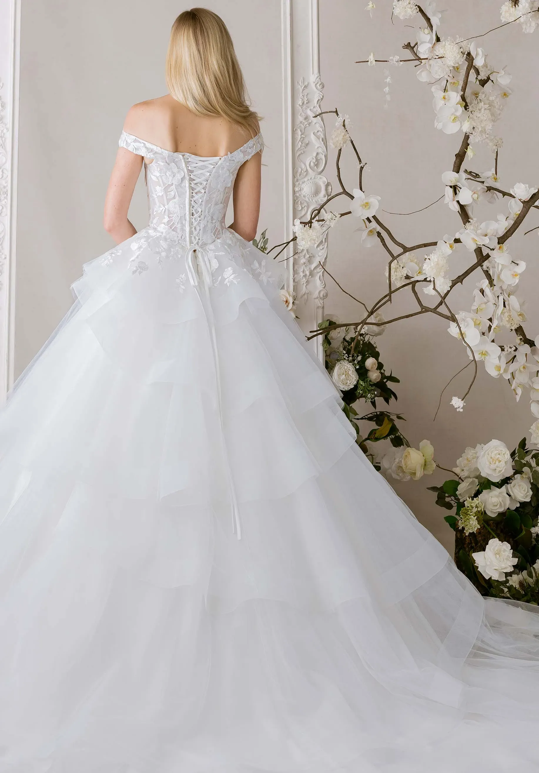 Romantic and voluminous, our Kya wedding dress moves with a sense of airy grandeur. The v-neckline frames an off-the-shoulder adorned with delicate floral threadwork embroidery. Boning adds structure, while a lace-up corset back sculpts the silhouette with elegance. A tiered ruffle tulle skirt cascades in a waterfall effect, adding drama with each layer defined with horsehair to float and sway like a true ballet. Matching veil sold separately as Style 55018.